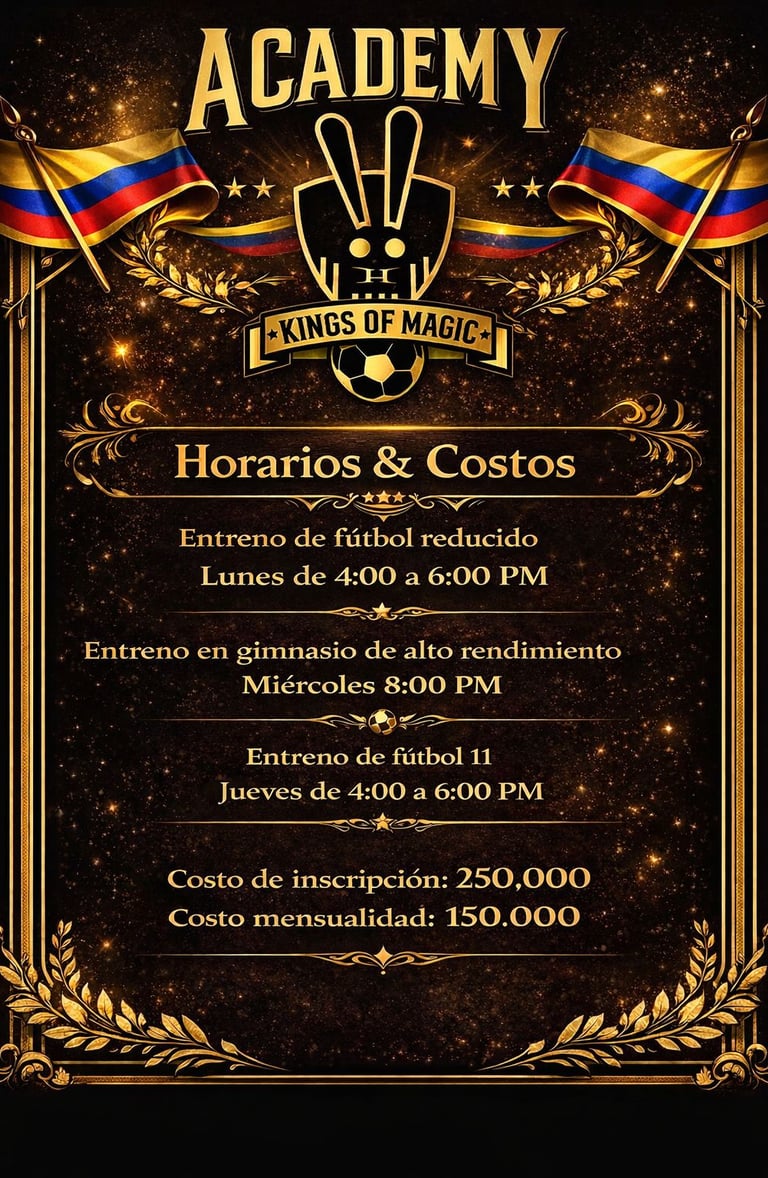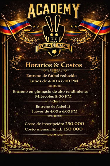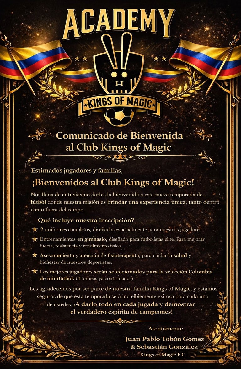 La Academia Kings of Magic FC es el primer paso para quienes sueñan con competir al más alto nivel. Nuestro modelo de formación está enfocado en el desarrollo progresivo del jugador, con entrenamientos exigentes, evaluación constante y convocatorias internas que permiten identificar y proyectar talentos hacia el equipo Kings of Magic FC. Aquí se forman jugadores con mentalidad ganadora y pasión por el fútbol.